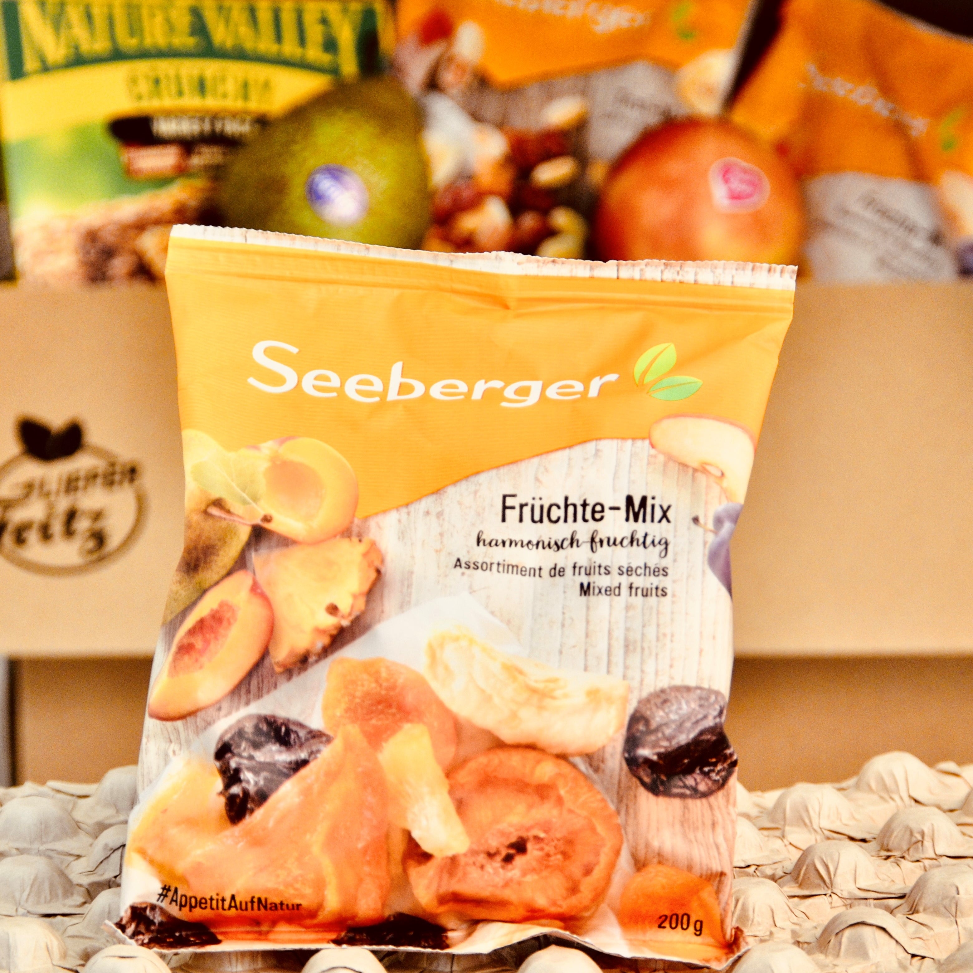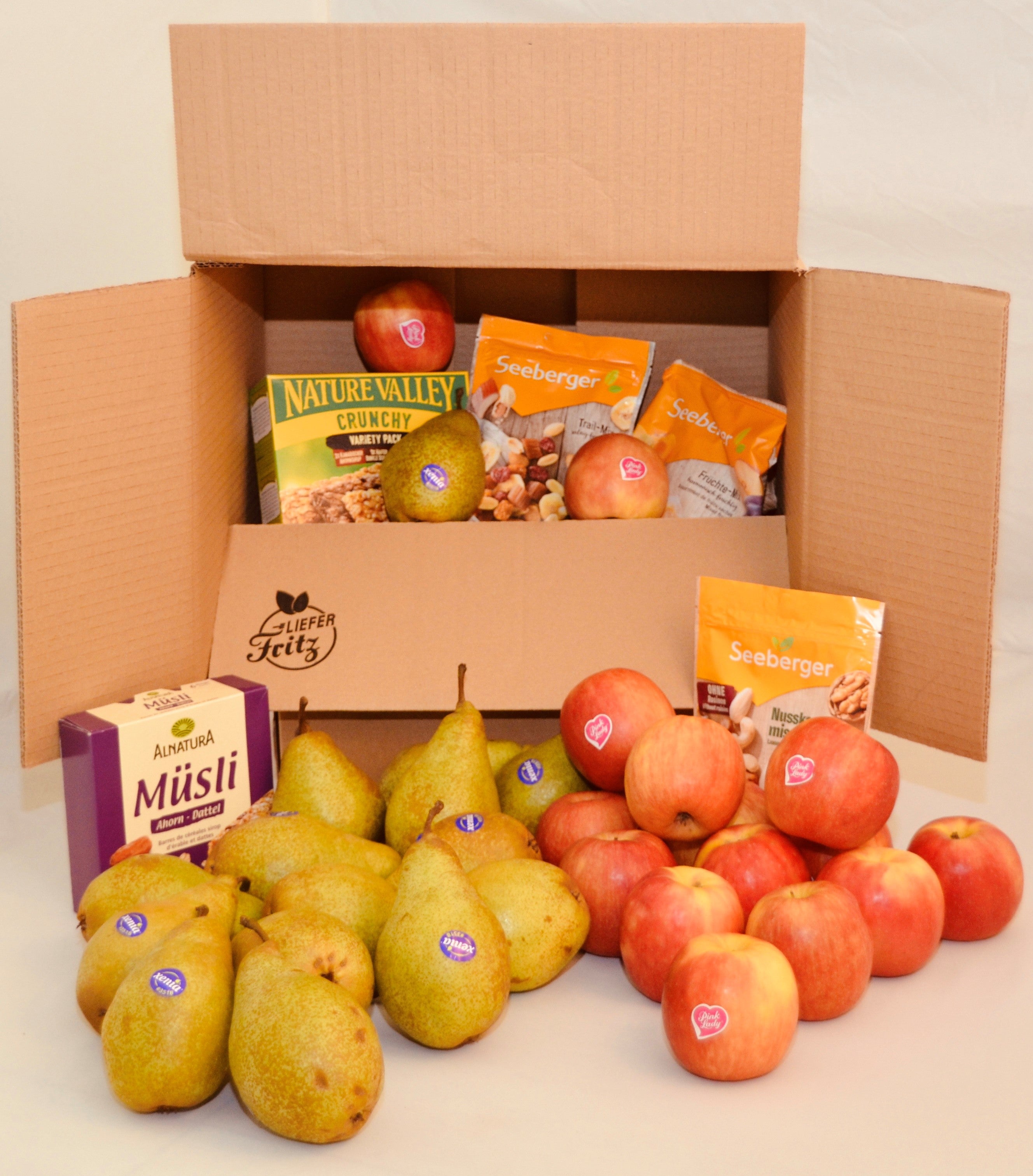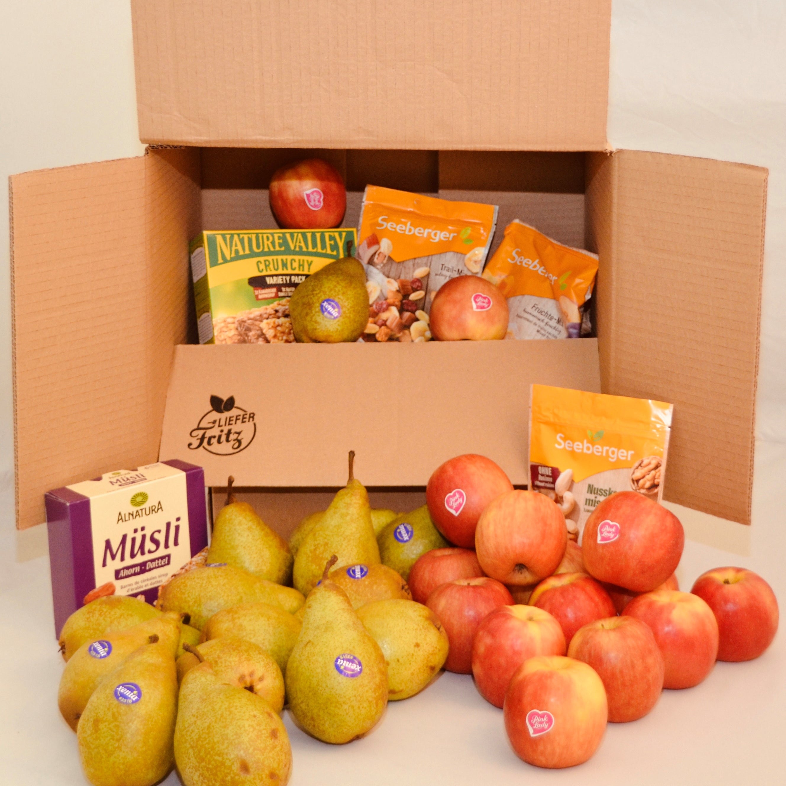 Deine LieferFritz® Box "Healthy Crunch" mit knackigem Obst und knusprigen Riegeln. Tu Deinen Kollegen etwas Gutes!